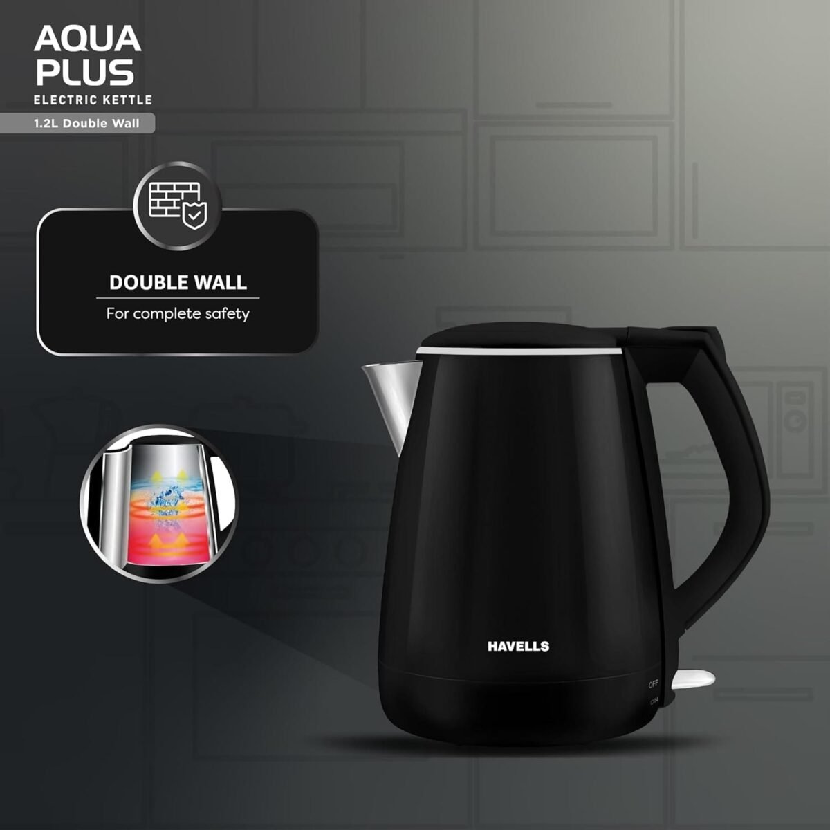 Havells Electric Kettle Aqua Plus 1250 Watts 1.2 liters , Double Layered Cool Touch Outer Body | 304 Rust Resistant SS Inner Body with Auto Shut Off | Wider Mouth | 2 Yr Manufacturer Warranty (Black)