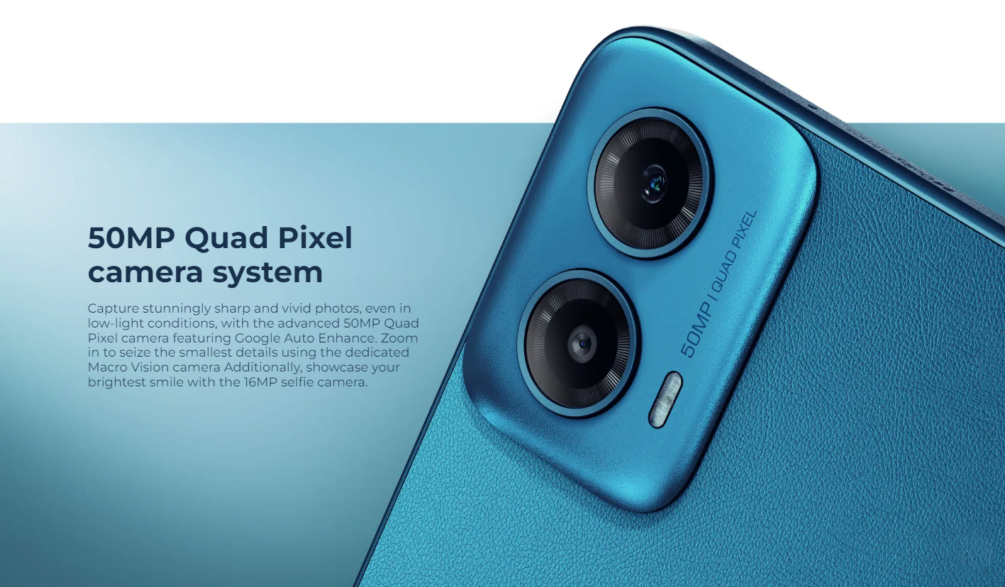 Look no further than the amazing Moto G34 5G smartphone, which is built to improve performance and add sophistication to your life. Powered by the LPDDR4X RAM and the Snapdragon 695 5G octa-core CPU, the Moto G34 5G offers the performance needed to fully utilise 5G networks. The Moto G34 5G sticks out with its slim, elegant, and light design. There’s a vegan leather special edition for an added bit of refinement. Take incredibly clear and vibrant pictures with the sophisticated 50 MP Quad Pixel camera with Image Auto Enhance, the Quad pixel camera system helps you take stunning pictures even in dim lighting. Plus it comes with advanced 16 MP Selfie Camera.