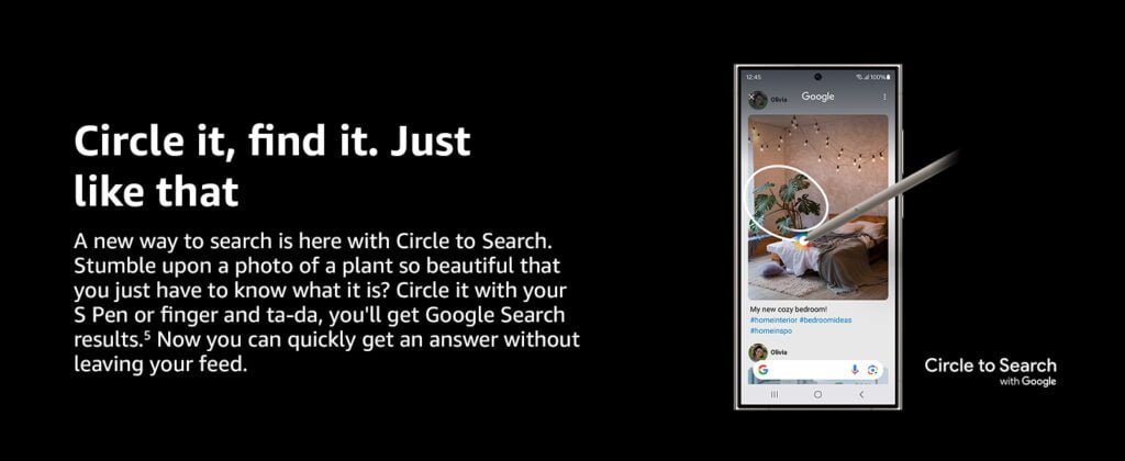 • A new way to search is here with Circle to Search. While scrolling your fav social network, use your S Pen or finger to circle something and get Google Search results.